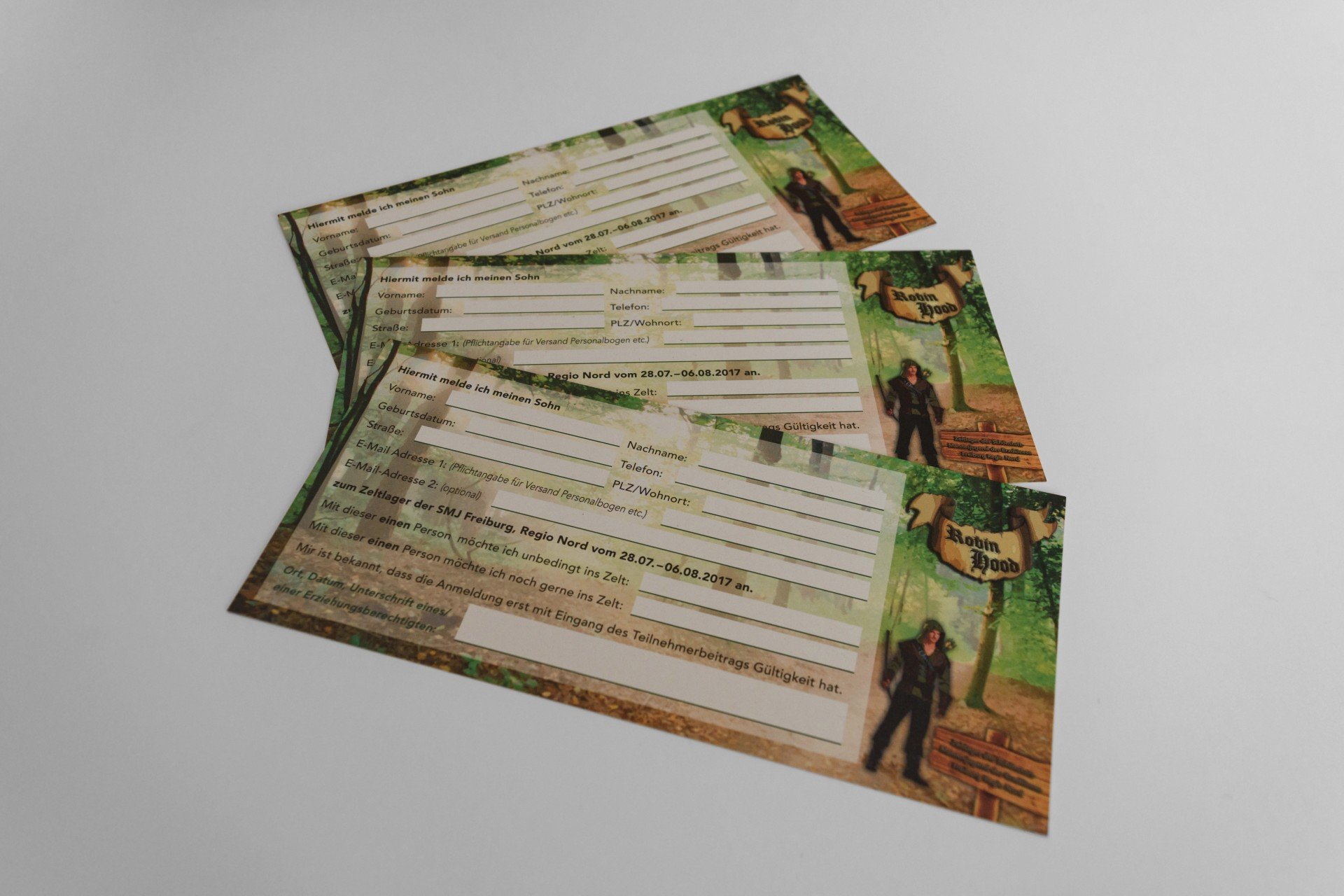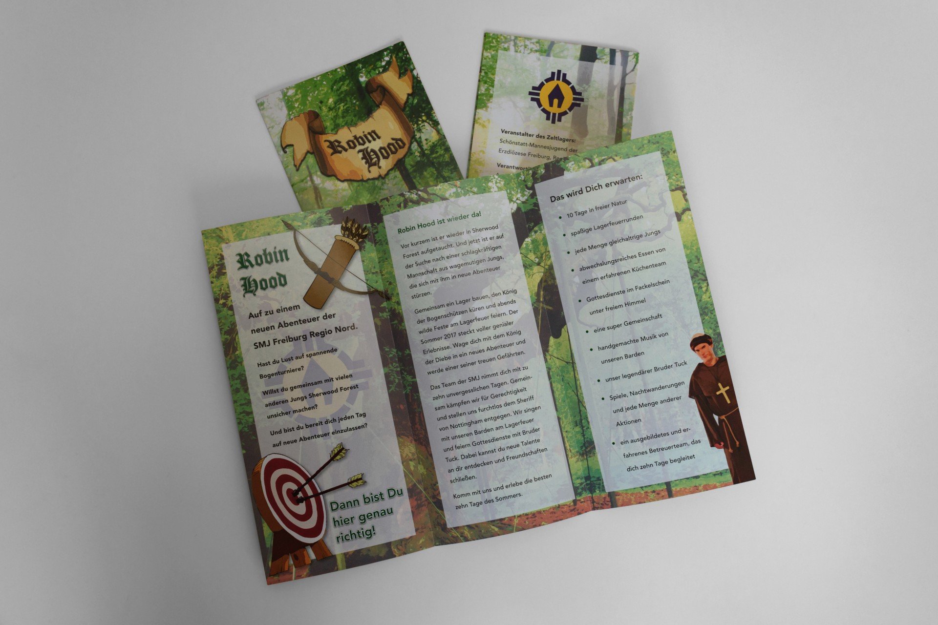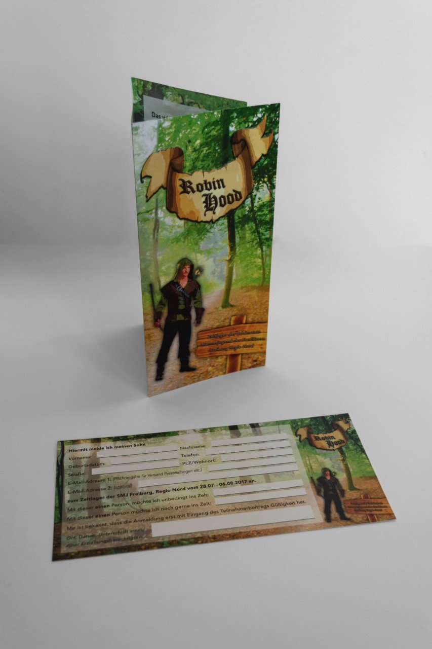 Das Motto des Zeltlagers der SMJ Freiburg Regio Nord, das in den Sommerferien 2017 stattfindet, lautet heuer „Robin Hood“. Wie bereits bei den zuvor erstellten Drucksachen sollte die Gestaltung dabei wieder die interessierten Jungen im Alter zwischen neun und 14 Jahren ansprechen. Und natürlich auch den Eltern alle benötigen Informationen liefern.