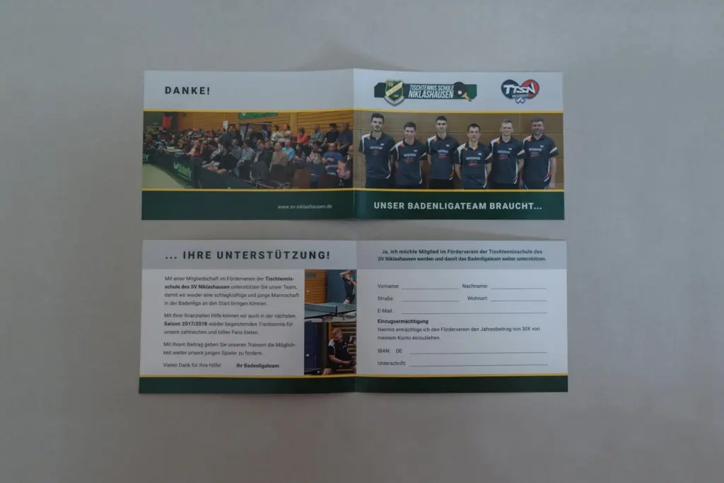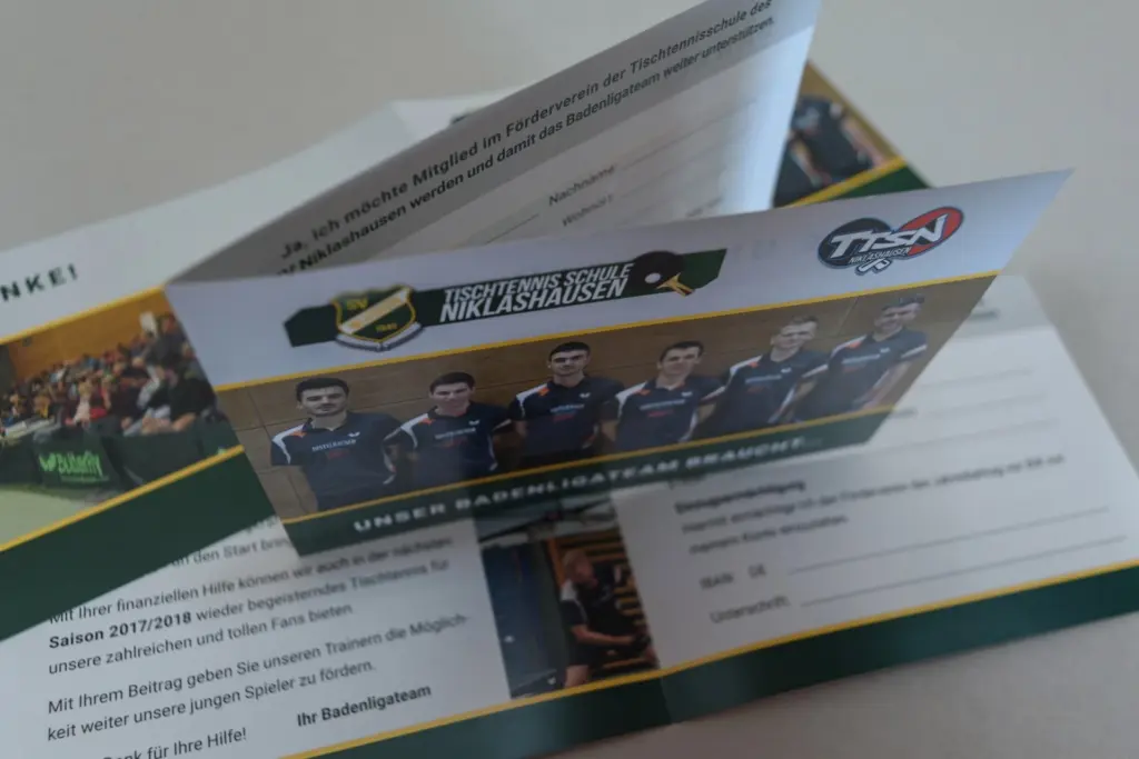 Dieses wird seit März an die Fans und Zuschauer bei Heimspielen verteilt, um Werbung für die Mitgliedschaft im Förderverein zu machen. Denn auch in der kommenden Saison 2017/2018 wollen die Niklashäuser in der Badenliga an den Start gehen und in der Region packendes Tischtennis anbieten.