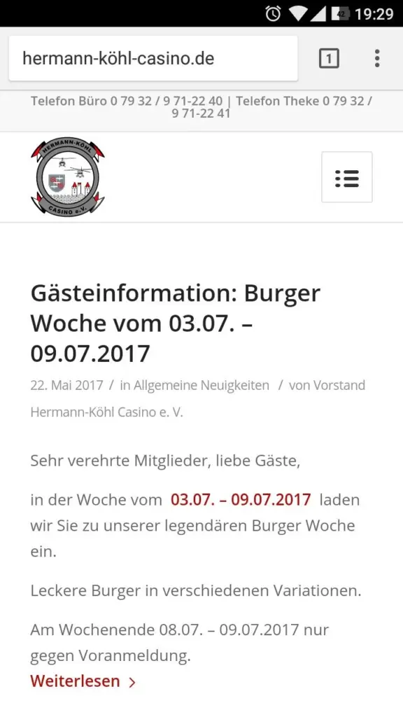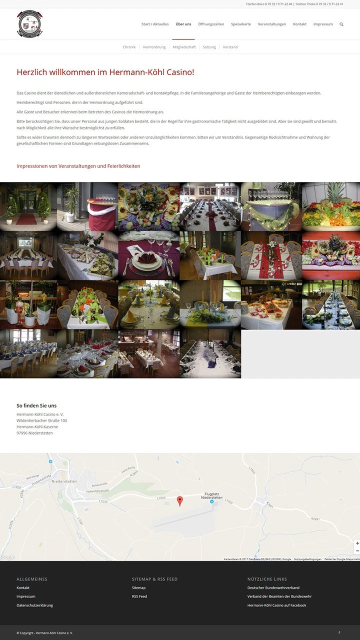 Das Hermann-Köhl-Casino in Niederstetten ist das Offizierskasino des dortigen Bundeswehrstandortes. Bereits im 4. Quartal 2015 begannen die grundlegenden Arbeiten an diesem Web-Projekt – alles fing mit der Registrierung der Domain an. Die Besonderheit: auf Kundenwunsch wurde eine Adresse mit internationalisiertem Domainnamen (ugs. Umlaut-Domain) angemeldet. Aus technischer Sicht verlief die Grundinstallation und Einrichtung des Web-CMS nach kleinen Modifikationen beim Hosting problemlos. Natürlich wurde auch bei dieser Website der Fokus auf Responsive Design gelegt, die Anzeige ist für Desktop-Browser sowie Tablets und Smartphones optimiert.