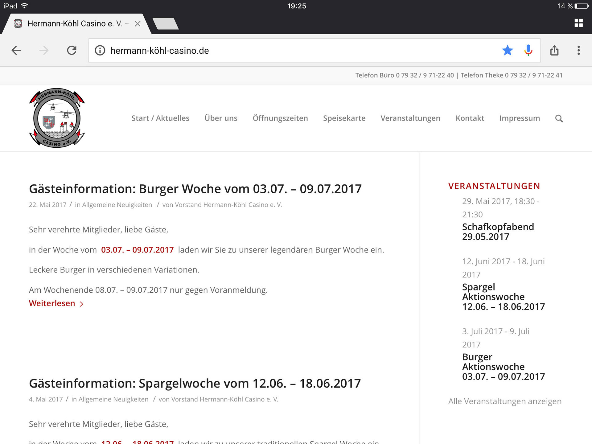 Das Hermann-Köhl-Casino in Niederstetten ist das Offizierskasino des dortigen Bundeswehrstandortes. Bereits im 4. Quartal 2015 begannen die grundlegenden Arbeiten an diesem Web-Projekt – alles fing mit der Registrierung der Domain an. Die Besonderheit: auf Kundenwunsch wurde eine Adresse mit internationalisiertem Domainnamen (ugs. Umlaut-Domain) angemeldet. Aus technischer Sicht verlief die Grundinstallation und Einrichtung des Web-CMS nach kleinen Modifikationen beim Hosting problemlos. Natürlich wurde auch bei dieser Webseite der Fokus auf Responsive Design gelegt, die Anzeige ist für Desktop-Browser sowie Tablets und Smartphones optimiert.