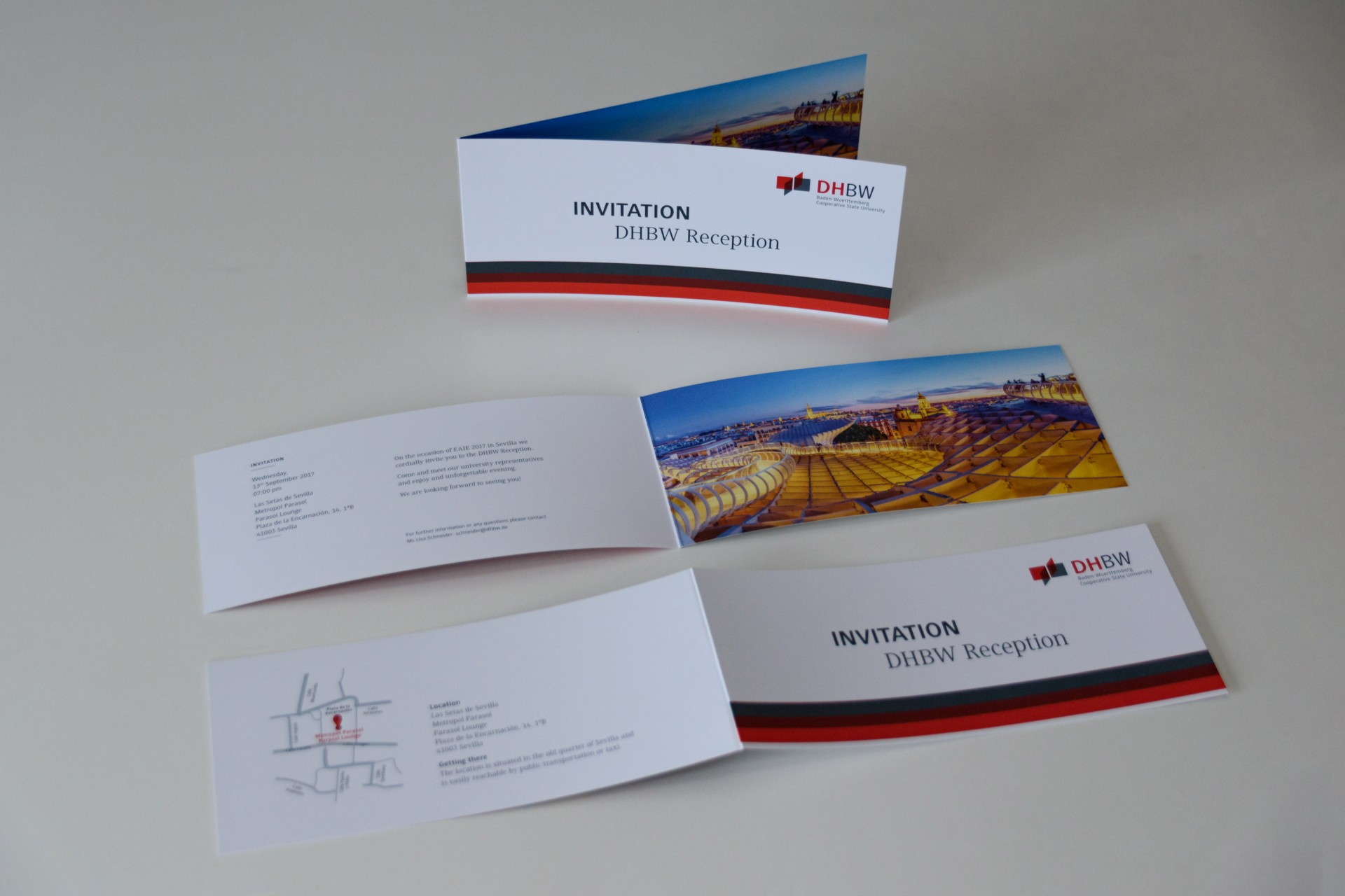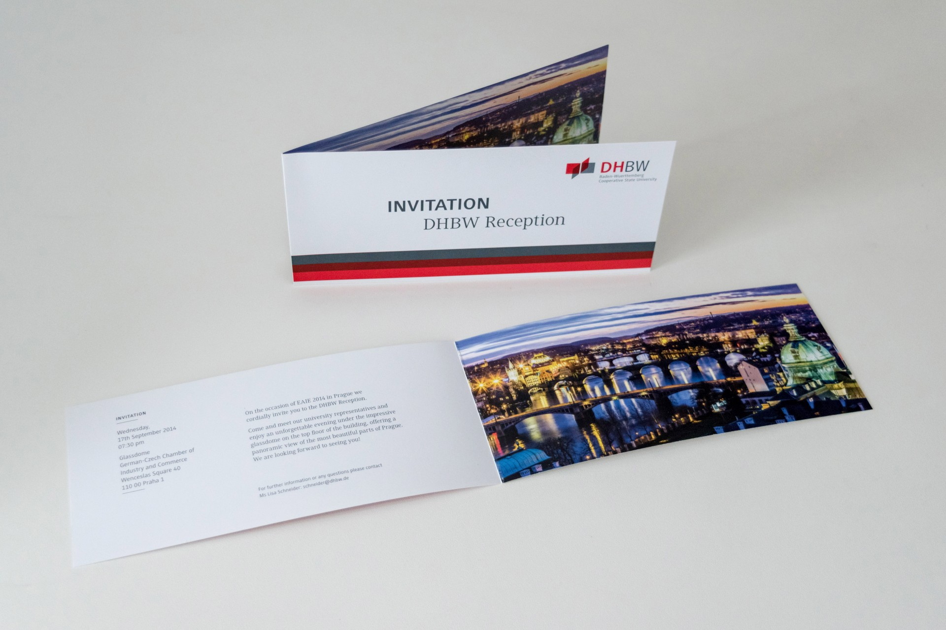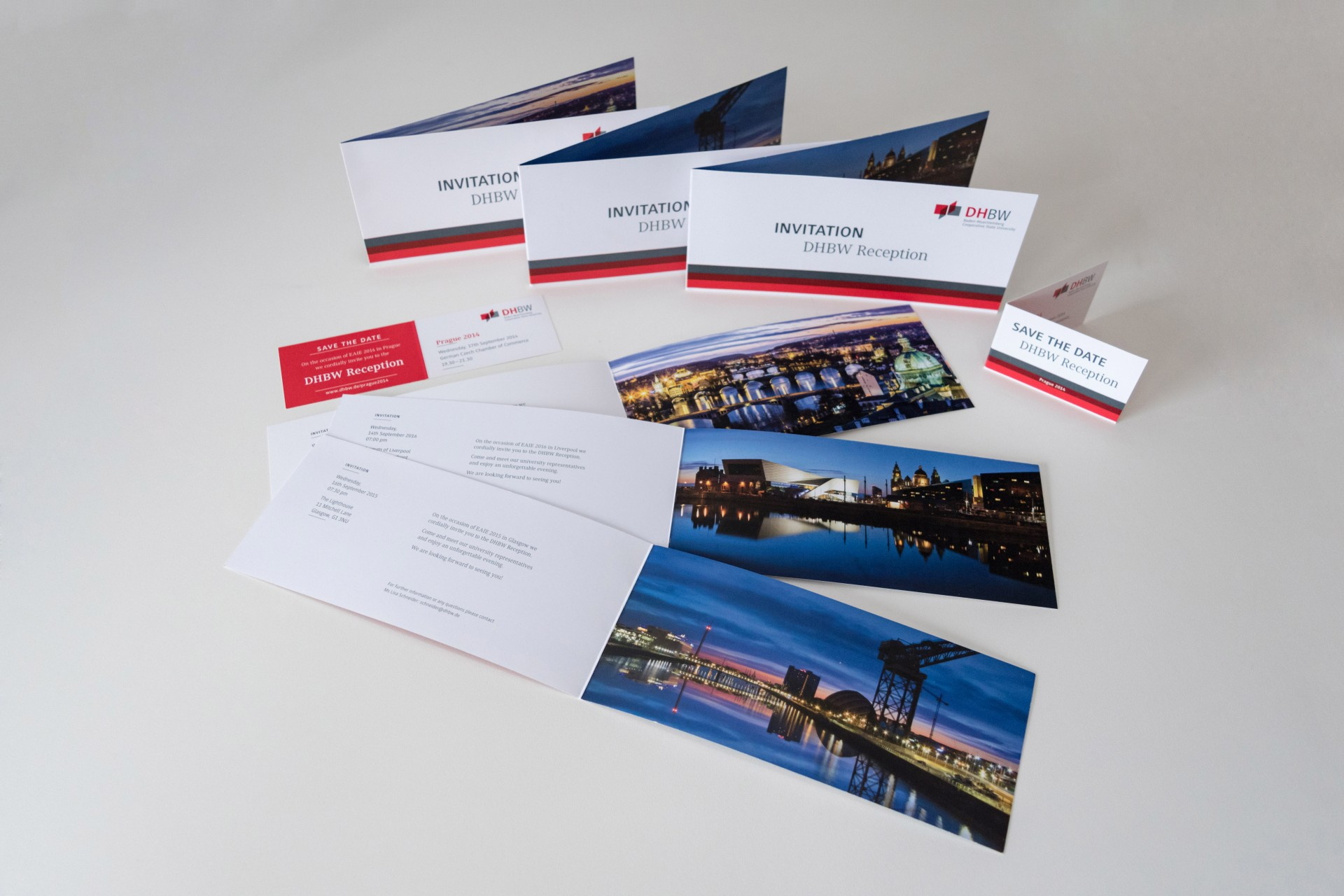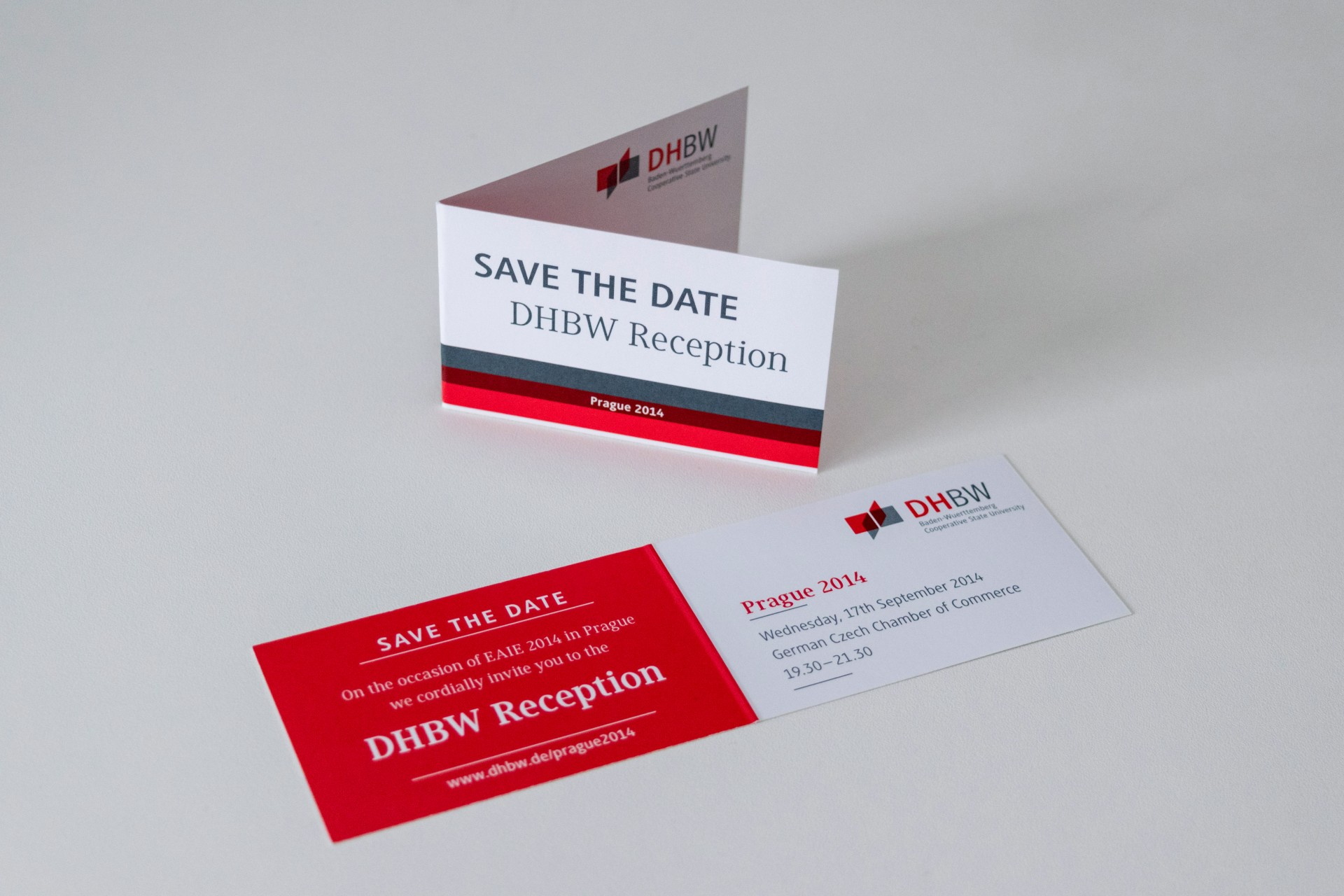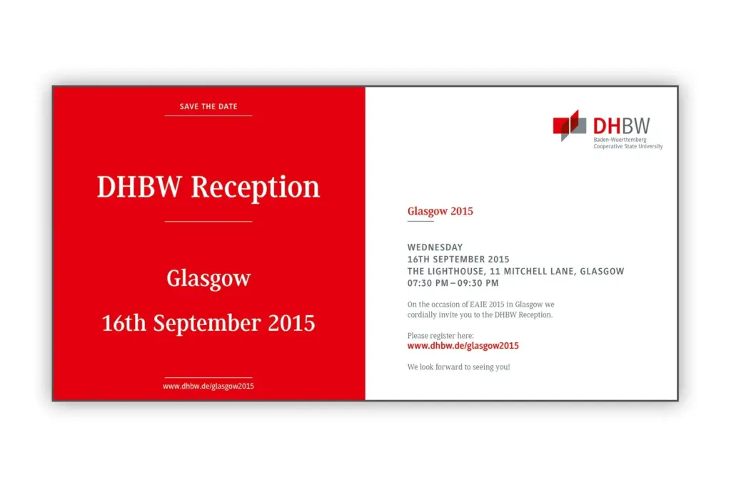 Damit alle Partner rechtzeitig informiert werden können, wird vorab eine „Save the date“ Information versendet – im Jahr 2014 noch in gedruckter Form, seit 2015 auf digitalem Wege per E-Mail. Neben der Gestaltung für die „Save the date“-Version, bin ich auch für die Layout-Erstellung der Einladungskarten zuständig. Diese müssen gemäß den Gestaltungsvorgaben der DHBW umgesetzt werden – hierbei kommt das Layout-Programm Adobe InDesign zum Einsatz.