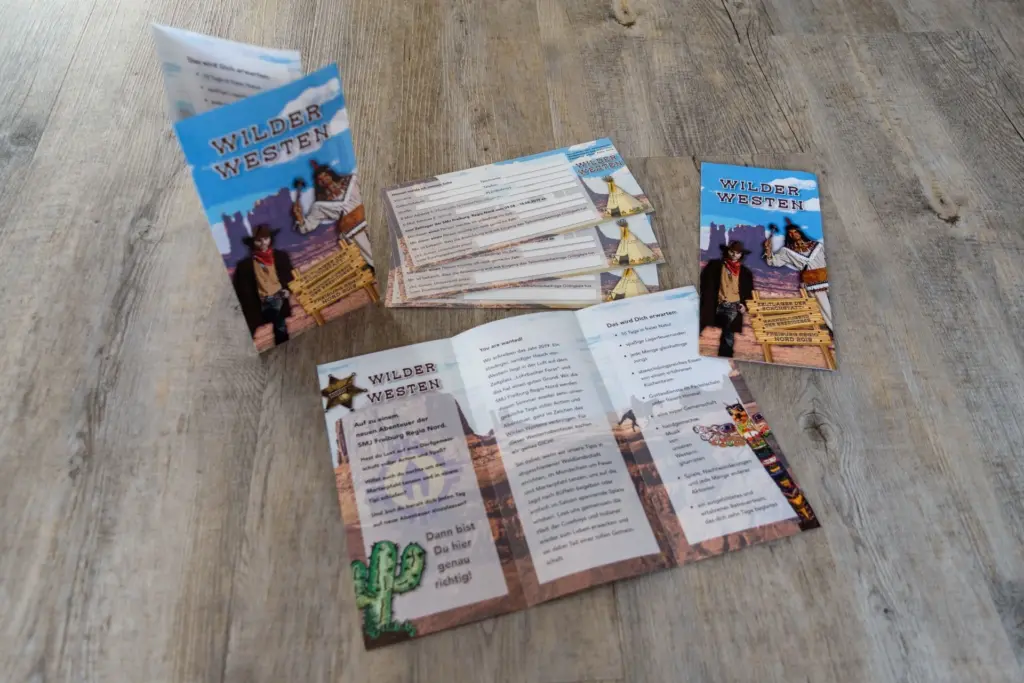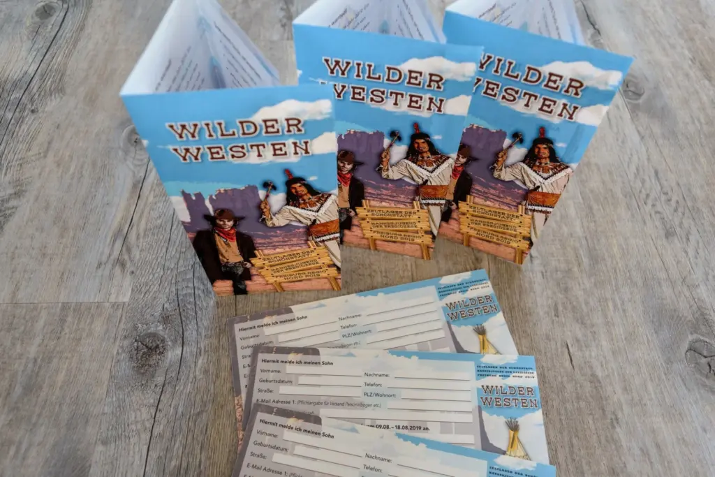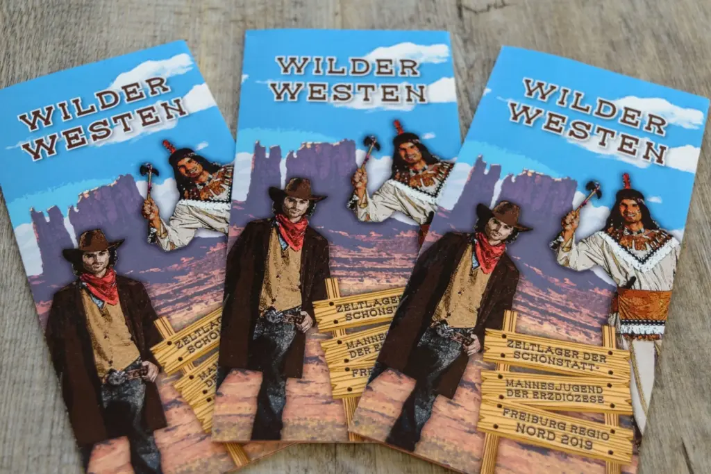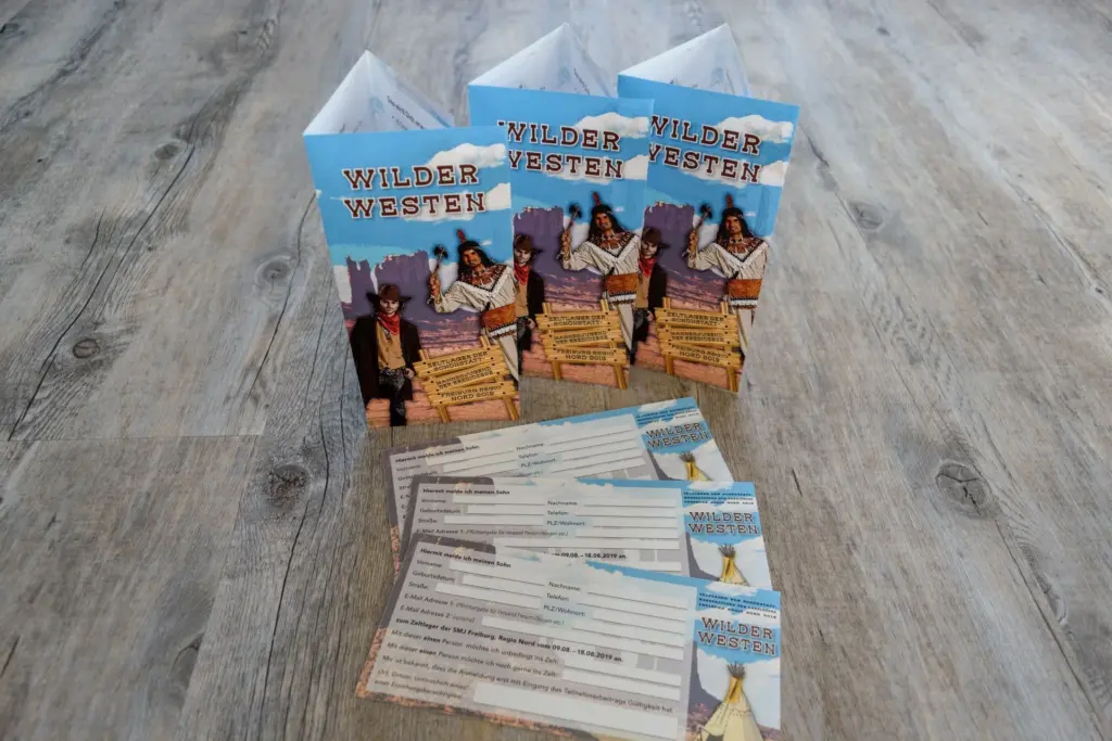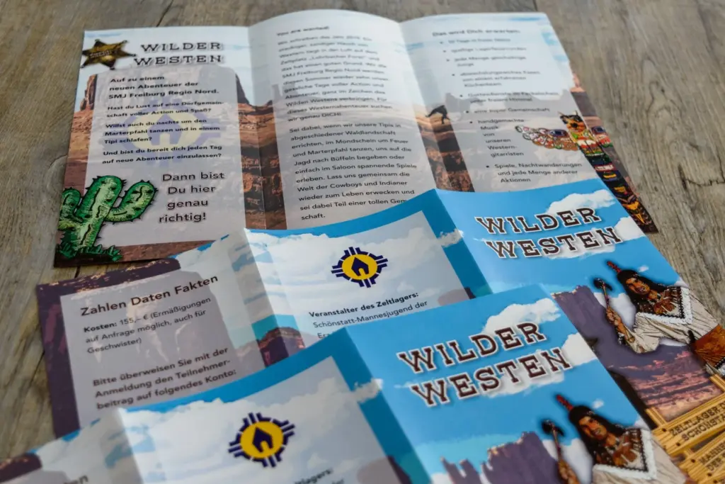 Auch 2019 findet in den Sommerferien wieder das Zeltlager der SMJ Freiburg Regio Nord für Jungen im Alter von neun bis 14 Jahren statt. Das Thema lautet heuer „Wilder Westen“. Hierfür wurde ich kurz vor Weihnachten 2018 erneut für die Layout-Erstellung und Produktion beauftragt, die wie gewohnt comichaft umgesetzt wurde. Die kurzfristige Beauftragung „zwischen den Jahren“ war kein Problem – trotz Feier- und Brückentagen sowie dem Jahreswechsel konnten die Drucksachen termingerecht zur Info-Veranstaltung geliefert werden.